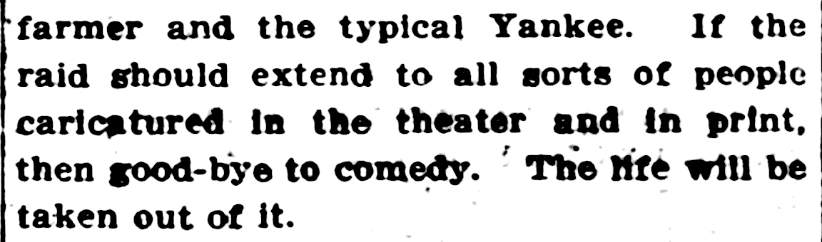 Comedian’s from 1903 declaring we can say, “good-bye to comedy” because racial and ethno stereotypes were banned on the stage.