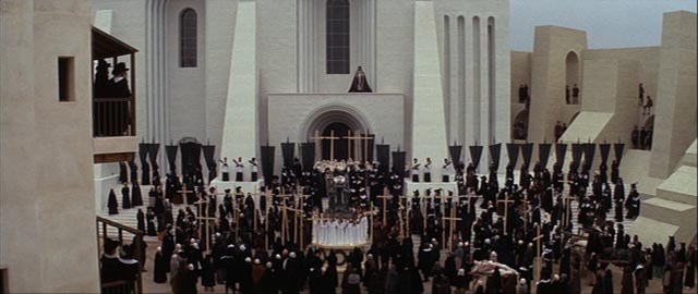 There is a film from 1971 by Ken Russell called The Devils. It was banned pretty much everywhere for its blasphemous sex scenes (the infamous raping of Christ being the main problem), and has still not been released in full by Warner Bros. But that film did something very interesting. If you watch it, it looks weird to the eye. The sets are all so… modern. The prison scenes have bright white tiles, brand new bars. The town walls and the castle are clean and built with new stone.