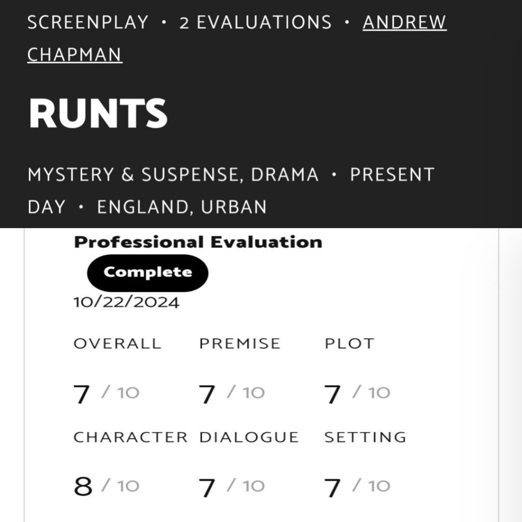 This has made my day! I just got a really excellent evaluation on The Black List for a screenplay I wrote called Runts. (I’ve shared the final part of the evaluation in the second image). A previous evaluation described the script as being “stunningly executed”.